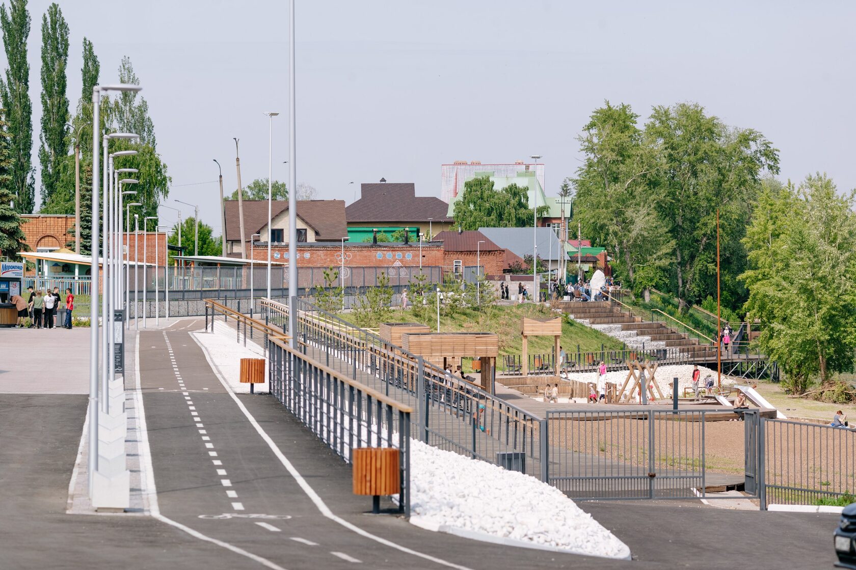 Улица Худайбердина, проходящая через весь город, упирается в реку и на этом участке становится связующей артерией между набережной и центральным сквером исторического центра. На ней сделан упор на удобство пешеходов, расширили тротуары, организовали комфортные пересечения, появилось активное озеленение. На набережной и улице появилась велодорожка.